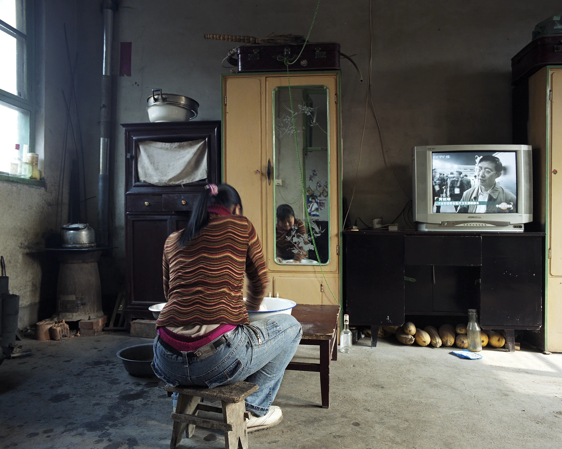 Today mr. Hou took me to another village nearby. It is the village of his wife’s grandmother. One of her grandsons will act as my guide. He should also have been in school. My English is difficult for him. It is the first time he hears the language spoken by a non-chinese person. Working with a guide in a small village has his disadvantages. Straight away you have half of the population coming with you. They ask him many questions – who I am, what we are doing, where we are going etc. We take a long walk through the village. In every house I first have to get all the people following us out of the room. They keep standing in the doorway and still try to push inside. In the third house I notice Cecilia in the first glimpse. I know instantly that she has to be in my picture, together with the beautifull rosa thermos and the fantastic TV antenna – a delight for every designer.